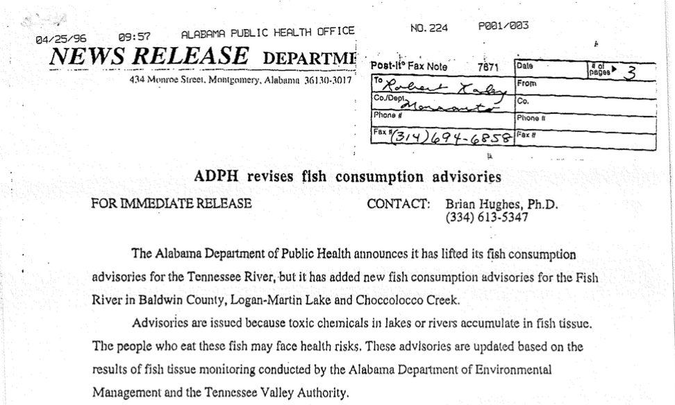 In 1996, the Alabama Department of Public Health released a report revising fish consumption advisories regarding PCBs. The report included revisions that lifted fish consumption advisories for one river which previously contained unsafe levels of the toxin DDT found in the fish, but added new fish consumption advisories for a river, lake, and creek where the fish sampled contained high PCB levels. The document warns: “Advisories are issued because toxic chemicals in lakes or rivers accumulate in fish tissue. The people who eat these fish may face health risks.”